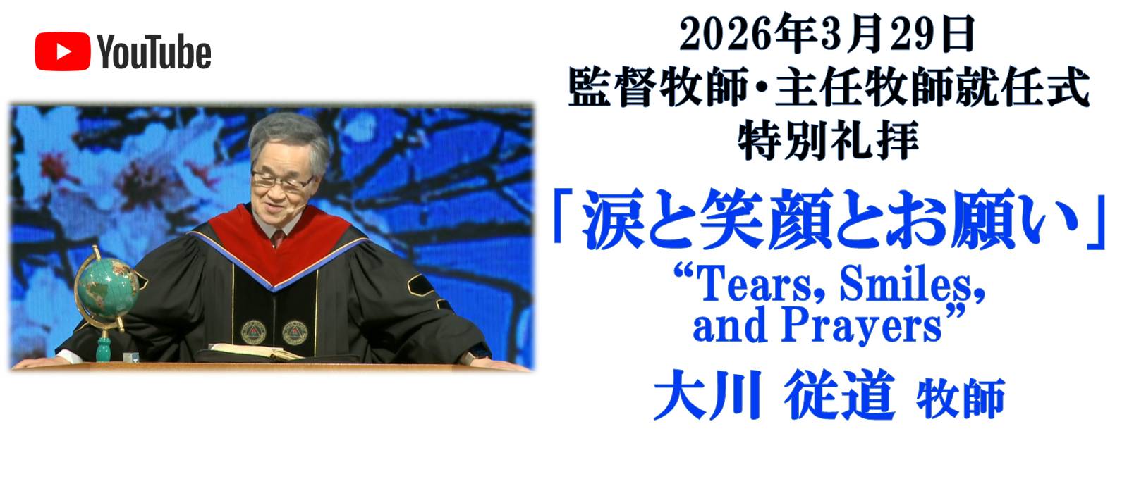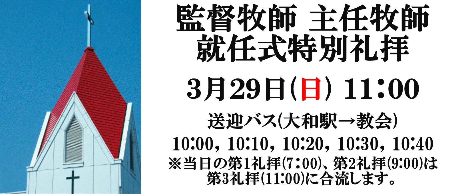 大川先生の監督牧師就任、小山先生の主任牧師就任特別礼拝をおこないます。是非ご参加ください。 日時:3月29日(日)11:00 送迎バス(大和駅→教会)10:00,10:10,10:20,10:30,10:40 ※当日の第1礼拝(7:00)、第2礼拝(9:00)は第3礼拝(11:00)に合流します。 詳細はこちら